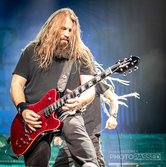 As the giant curtain drops and the crew whisk it away, the eight or so of us photographers scrambled to start shooting. Lamb of God had started playing before the curtain fell and in the media pit with us were a few V.I.P. purchasers. There was no chance of taking a break. Lamb of God would simply not permit it. They were unyielding and persistently moving about the stage with purpose, the way a caged tiger does in a zoo. You almost felt as though if these guys leaped from the stage, they would rip us to shreds. They hit on all five of our senses. You could see the fierceness on their faces, you could hear the deafening growls and roars, you could feel the heat from the 6-foot flames, you could taste the electricity that hung in the air, and you could touch the sweat that rained down upon you from the windmill headbanging. At one point Randy Blythe stood on his platform and proclaimed that they came to Nebraska to do one thing only. "Fxxk this sxxt up"!! Later, the band walks off only to quickly return and finish with Vigil, Laid to Rest and Redneck.